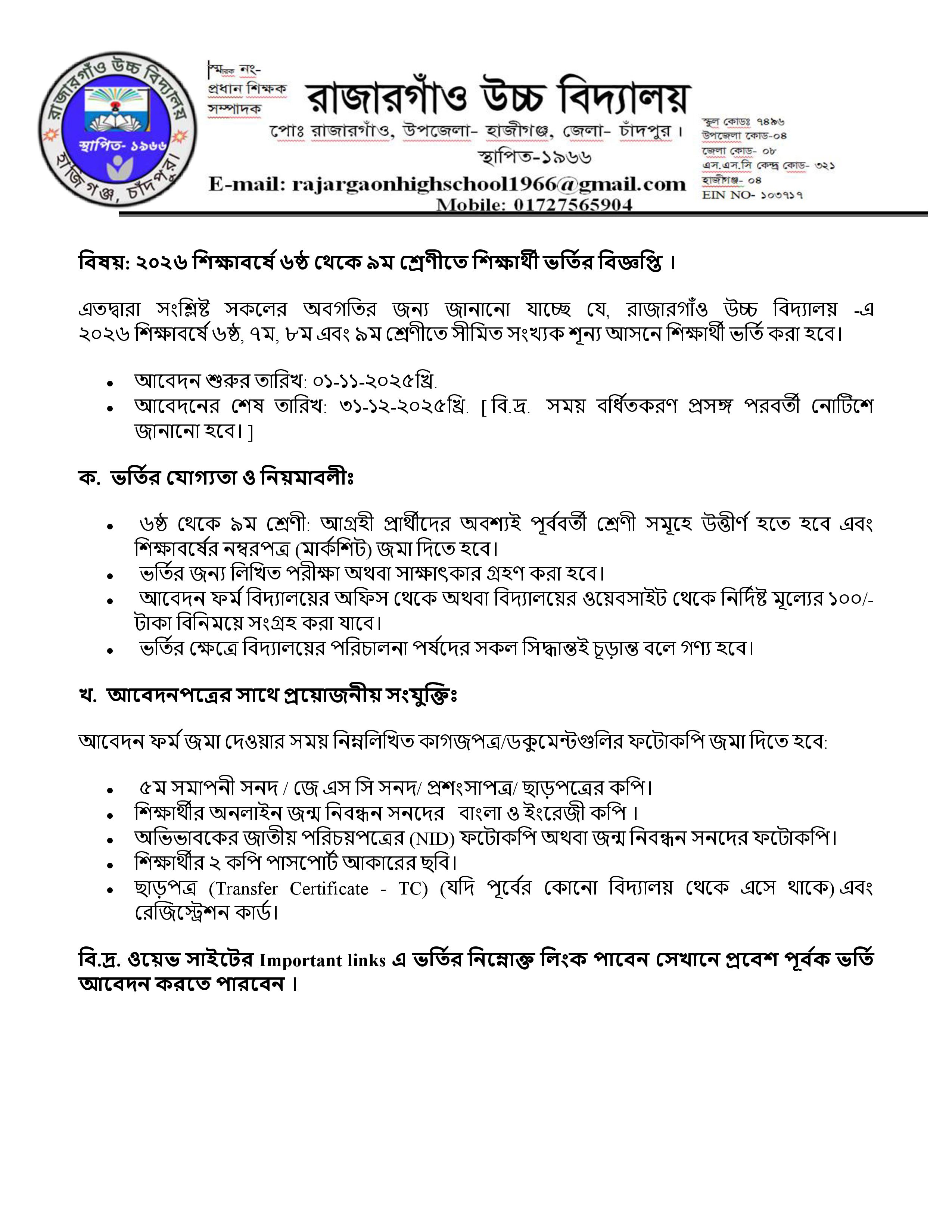 এতদ্বারা সংশ্লিষ্ট সকলের অবগতির জন্য জানানো যাচ্ছে যে, রাজারগাঁও উচ্চ বিদ্যালয় -এ ২০২৬ শিক্ষাবর্ষে ৬ষ্ঠ, ৭ম, ৮ম এবং ৯ম শ্রেণীতে সীমিত সংখ্যক শূন্য আসনে শিক্ষার্থী ভর্তি করা হবে।